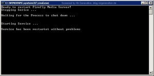 I noticed that Firefly seems to be buggy from time to time. The more music you listen to during the day, the more it takes cpu resources. After two days, the server got so slow, that I had to restart it. That’s why I created a Task (similar to Cronjob for Linux), that runs a Batch-file at every night 4 am. I took this time, because I am sure that I’ll be sleeping at such time, so it wouldn’t matter if the media server would be down for some seconds. A restart causes all active connections to break, of course.