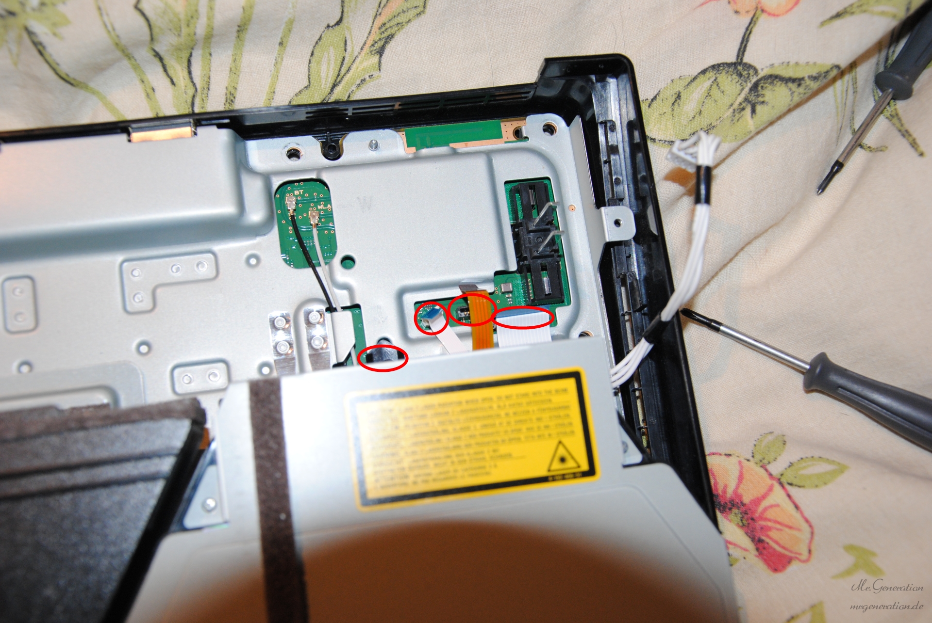 Wenn ihr die 15 Minuten gewartet habt, kann die Operation schon beginnen. Nehmt als erstes den spitzen Gegenstand, und öffnet die Abdeckplatte am Boden zur Frontseite. Darunter befindet sich eine blaue Schraube, die ihr mit dem Kreuzschlitzschraubendreher lösen müsst. Als nächstes schiebe die Abdeckklappe mit den DVD (und Co) Aufdrucken leicht nach links, der Kappe könnt ihr dann vorsichtig abnehmen.