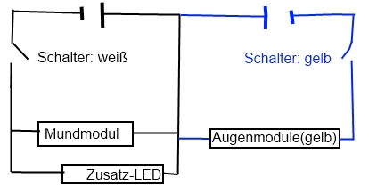 Bis zum jetzigen Zeitpunkt waren alle Module immer nur temporär aneinander mit dem Akku verbunden. Da das nicht so bleiben kann, werden nun die jeweiligen Kreise gebildet. Die untere Grafik soll diese einfach mal etwas verdeutlichen. Es wird für die Zusatz-LEDs und das Mundmodul ein eigener Kreislauf mit einem Schalter aufgebaut, wodurch der Kopf sich rein weiß beleuchten lassen kann. Durch einen zweiten Kreislauf, in dem nur die Augenmodule hängen, können die Augenhöhlen zusätzlich gelb unterlegt werden. Man könnte die gelben Module natürlich auch im stand-alone Betrieb betreiben.