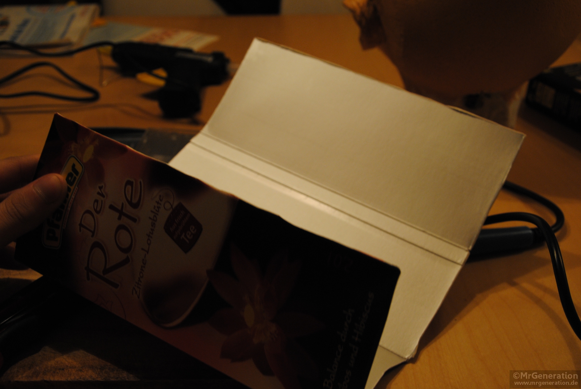 Damit der Akku nicht viel Luft zum bewegen hat, habe ich eine Art abnehmbaren Gurt aus Pappe gebastelt. Außerdem liegt der Akku auf einer Abdeckplatte aus einer Pralinenschachtel. Diese besteht im Grunde lediglich aus Papier, hat jedoch große mit Luft gefüllte Zwischenräume, die wie ein Polster wirken – also nicht nur gut für Schokoalde. Zum Schluss nochmal einschalten um sicherzugehen das nichts kaputt gegangen ist und natürlich, damit der Ärger umso größer wär, wenn es nach dem Zusammenbau nicht mehr läuft.